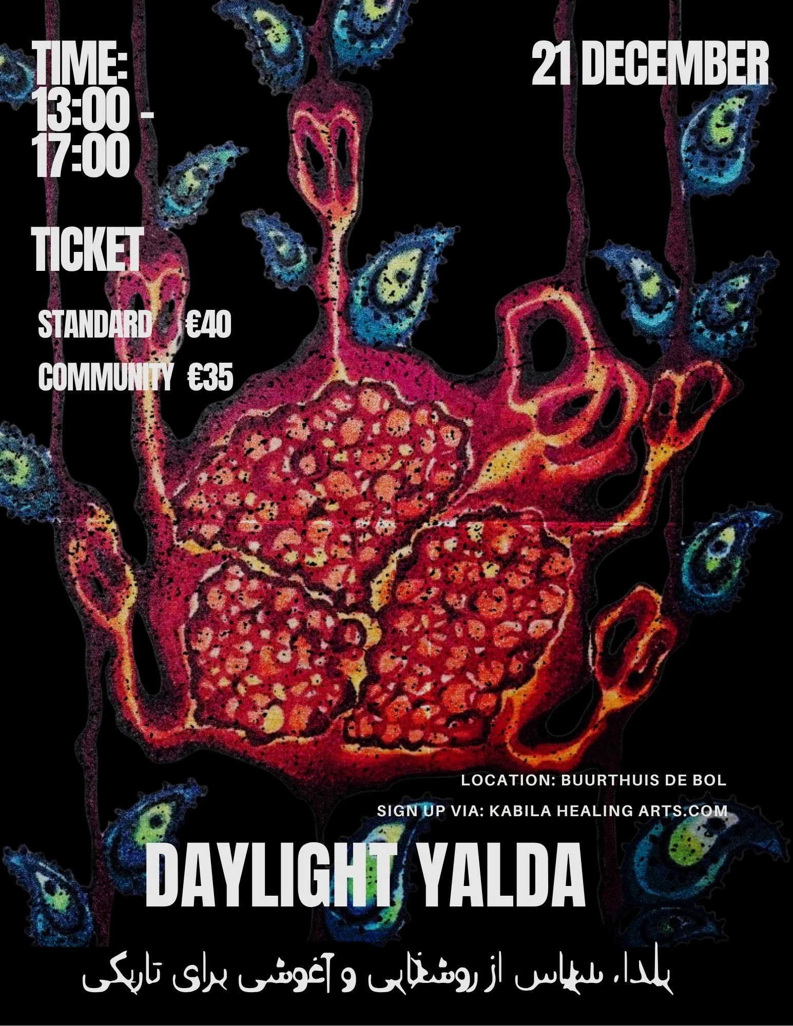 Daylight Yalda is a creative community gathering that honors the symbolism of Yalda  the balance between darkness and light, shadow and renewal.
